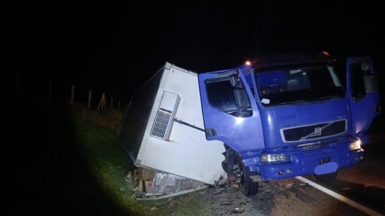 Caminhão refrigerado tomba em rodovia após quebra de eixo