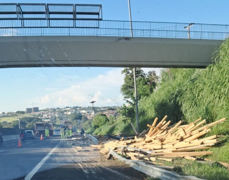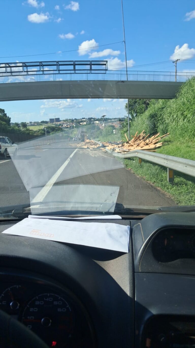 Caminhão tomba carga de madeira no Contorno da SP-294 em Marília