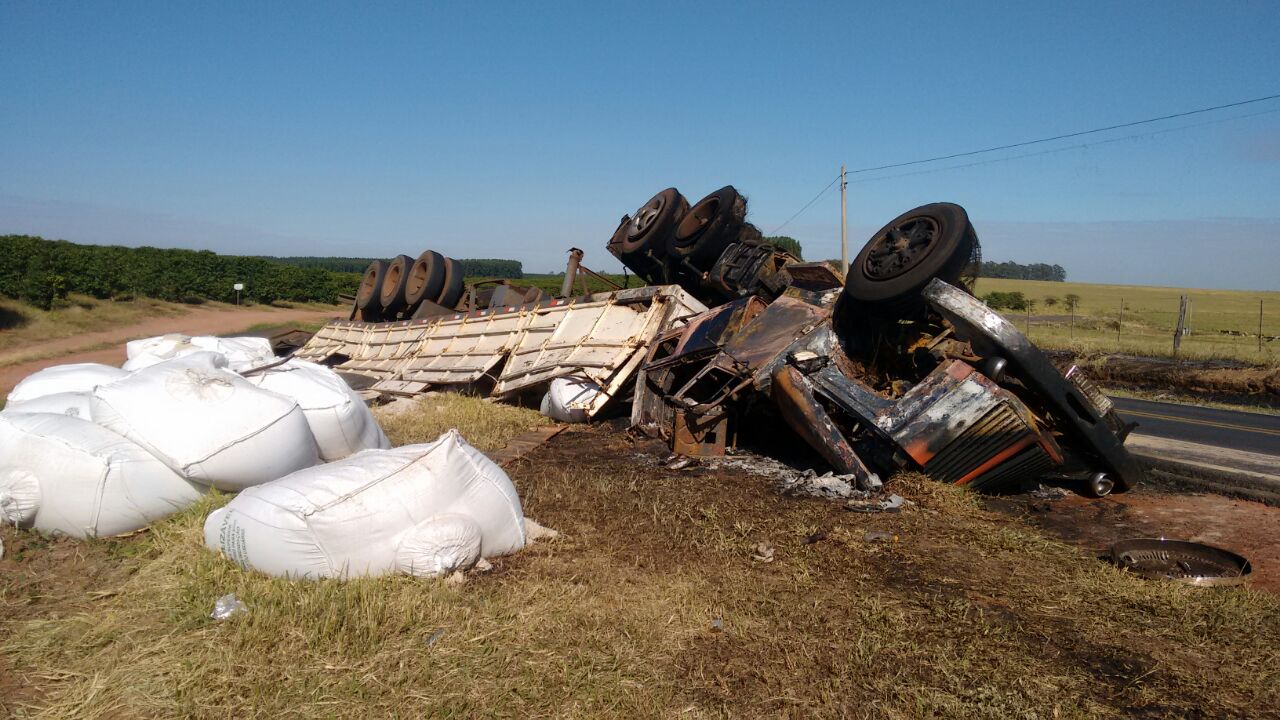 Equipes do Corpo de Bombeiros foram acionadas e controlaram rapidamente o incêndio. Por sorte o motorista do veículo carregado com fertilizante conseguiu sair a tempo e sem ferimentos graves.
