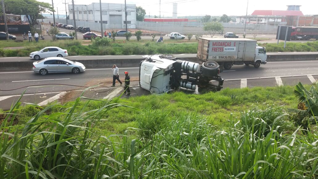 Um caminhão tombou no final da tarde desta segunda-feira (14), na Rodovia do Contorno, próximo da indústria Marilan, na zona sul de Marília.
