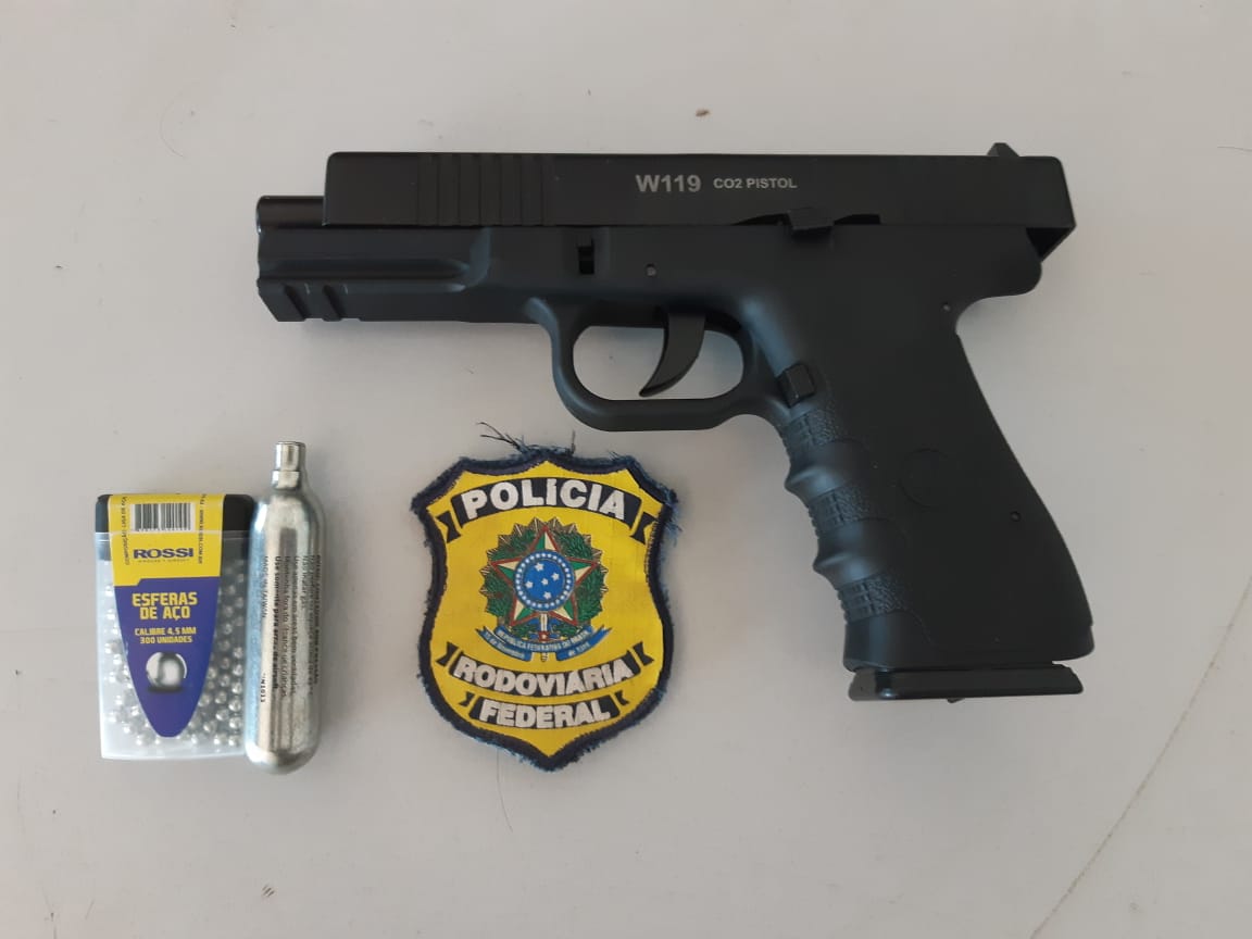 Os policiais fizeram diligências e conseguiram abordar o caminhoneiro próximo ao quilômetro 200 da BR-153. Com ele foi encontrada uma arma tipo ‘airsoft’.