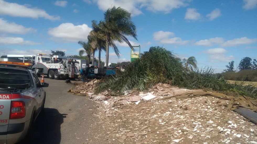 A carga de material para construção ficou espalhada pelo acostamento da pista. O trabalho de resgate e limpeza do local se estendeu para a tarde de sábado, mas não prejudicou o tráfego de veículos.