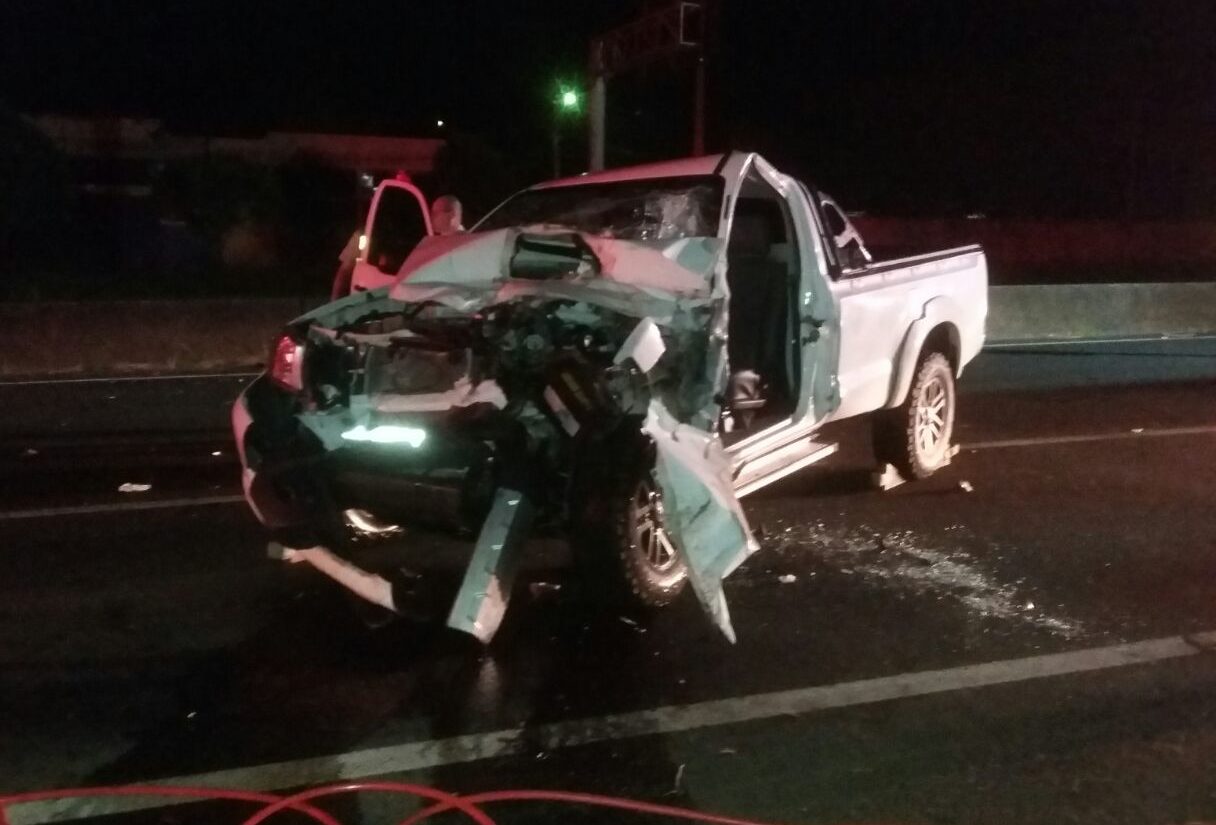 Uma caminhonete Toyota Hilux ficou com sua parte frontal destruída após colisão com a traseira de um caminhão que transportava leite na madrugada desta quarta-feira (25), na rodovia SP-294, em Marília.
