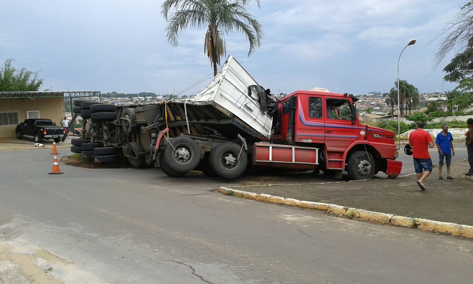 A carga de um caminhão carregado com madeira tombou agora há pouco, no final da rua Doutor Joaquim de Abreu Sampaio Vidal, zona oeste de Marília.