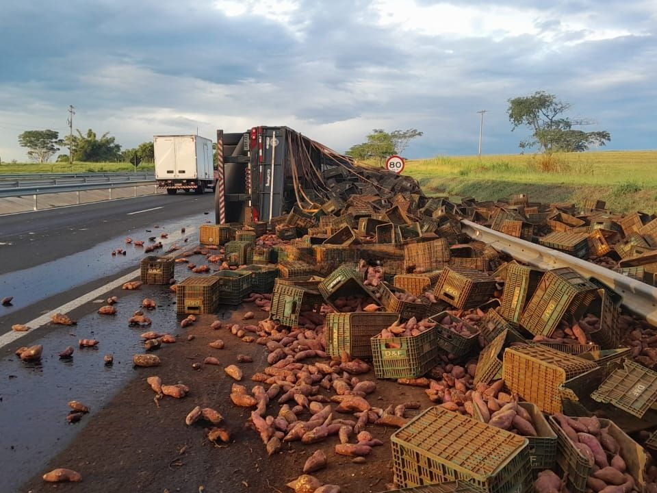 Uma carreta carregada com cerca de 30 toneladas de batata-doce tombou e provocou interdição parcial da rodovia Rachid Rayes (SP-333) em Marília. O acidente aconteceu no km 348, no sentido de Assis a Marília, na tarde desta terça-feira (3), mas até a manhã desta quarta (4) as equipes ainda trabalhavam para a desobstrução completa e limpeza da via.