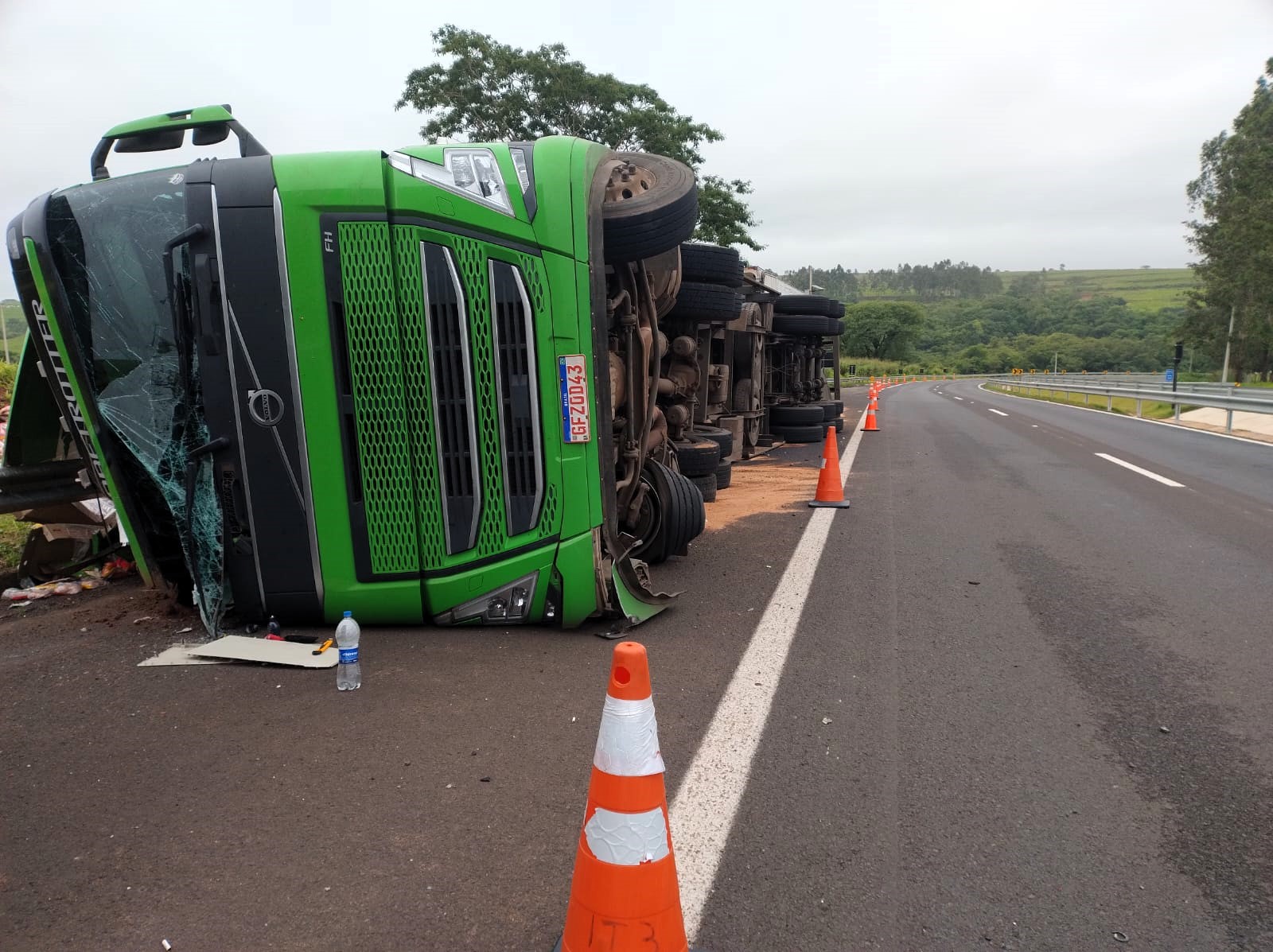 O caminhão acabou saindo para o acostamento, esgarçando o guard rail até tombar, esparramando a carga fria em área rural. Parte dos produtos foi baldeada para outros dois caminhões na manhã deste sábado (30).