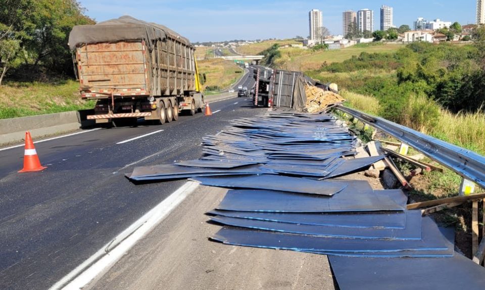 O veículo estaria carregado com madeira e parte da carga ficou espalhada pela pista. Ainda não há informações sobre o que pode ter causado o tombamento.