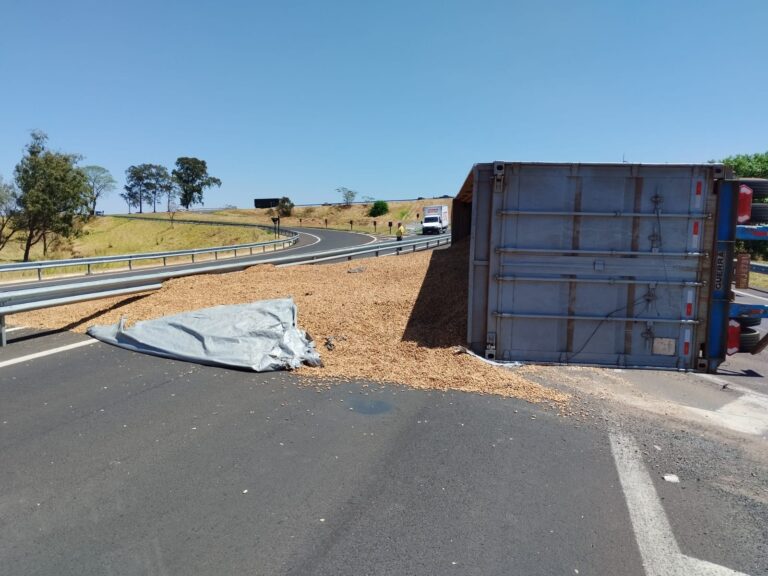 Uma carreta tombou na manhã desta quarta-feira (24) em uma alça de acesso da rodovia Comandante João Ribeiro de Barros (SP-294), na zona norte da cidade. Não há informações sobre feridos.