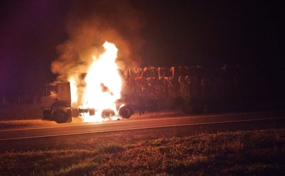 Uma carreta ficou totalmente destruída depois de pegar fogo na noite desta segunda-feira (17), na Rodovia Transbrasiliana (BR-153), em Marília.