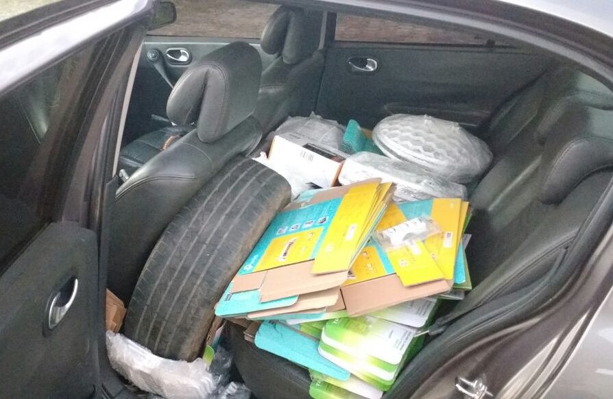 Durante vistoria foram localizadas diversas mercadorias de procedências desconhecidas e sem notas fiscais, abarrotadas no porta-malas e no banco traseiro. O caso foi registrado como contrabando.