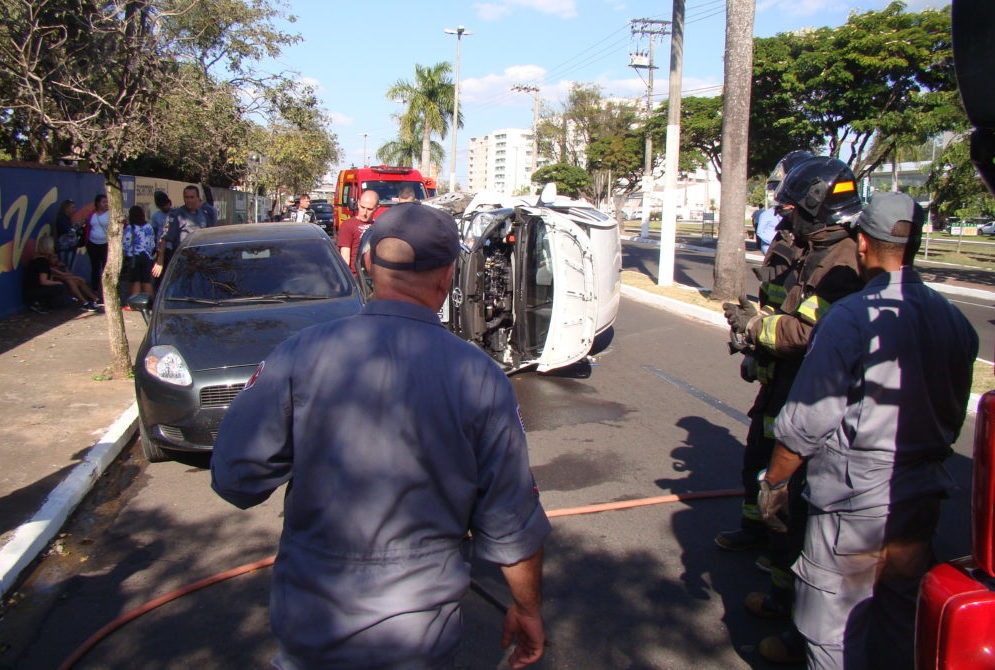 Desatento, o condutor do carro branco bateu em um Fiat Punto preto e se assustou, virando o volante bruscamente, o que provocou o tombamento.
