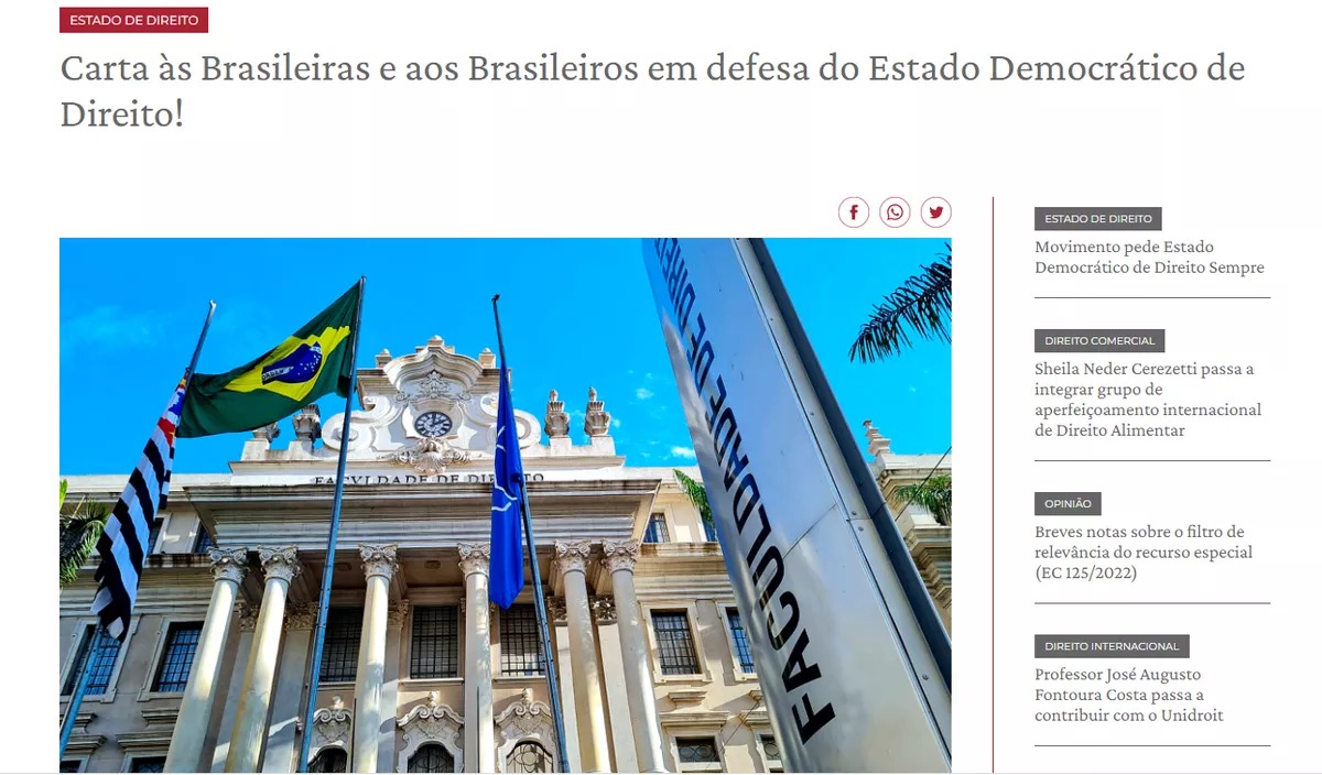 Além dessa carta, outro manifesto está sendo preparado pela Federação das Indústrias do Estado de São Paulo (Fiesp), intitulado “Em Defesa da Democracia e da Justiça”, e faz parte de um dos atos organizados para ocorrer no dia 11 de agosto, na Faculdade de Direito da Universidade de São Paulo.