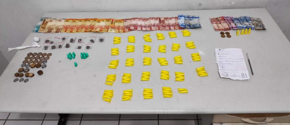 Na pochete foram apreendidos um papel com contabilidade de tráfico, 142 pinos de cocaína, 15 porções de maconha e R$ 1.570,80. Com Gislaine havia mais quatro pinos de cocaína e R$ 91.