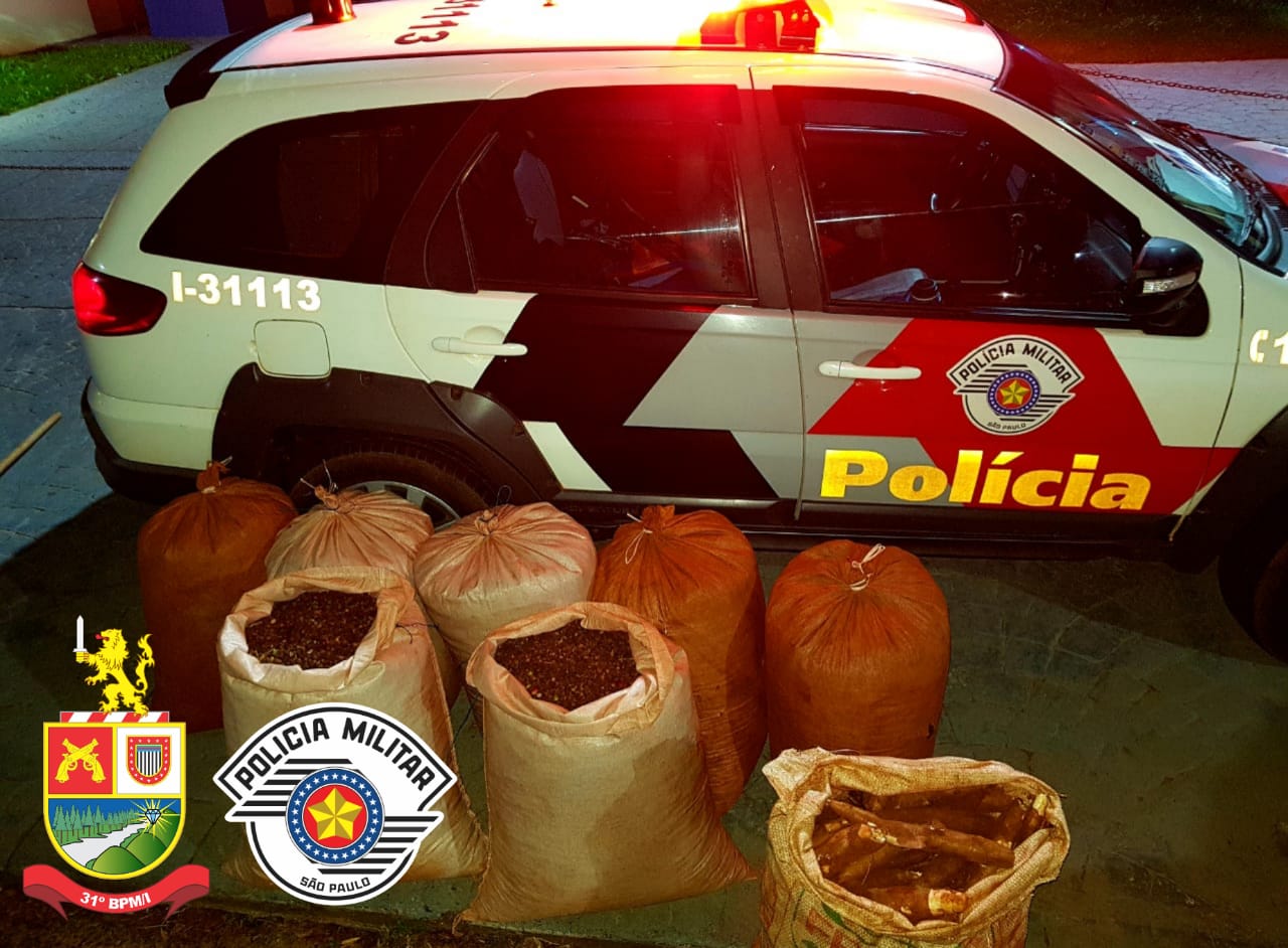 No interior do veículo estava o casal e também foram localizados sete sacos totalizando 350 quilos de café, um saco de mandioca com 50 quilos e um saco de laranja com 50 quilos.