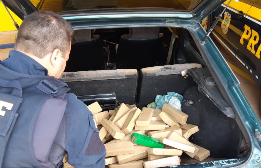 Devido o nervosismo dos ocupantes, foi feita uma vistoria minuciosa no veículo e ao verificar o conteúdo do porta malas, foram localizados 93 tabletes de maconha, com peso de 56.3 quilos.