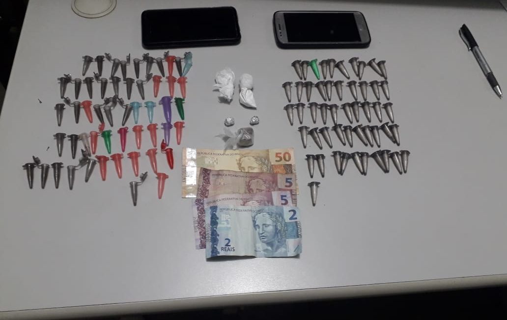 O veículo foi acompanhado e abordado. Com o condutor foram encontradas duas pedras de crack, já com a passageira 51 pinos de cocaína, 52 pinos vazios e R$ 62.