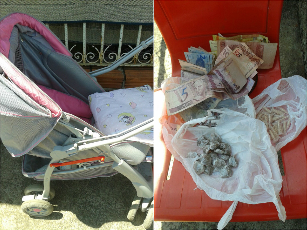 Inicialmente os militares encontraram um pino de crack no carrinho e chamaram Caroline Aparecida da Silva Lima, também de 21 anos, que estava dentro do imóvel, para pegar a criança e deixar o objeto livre para ser revistado.