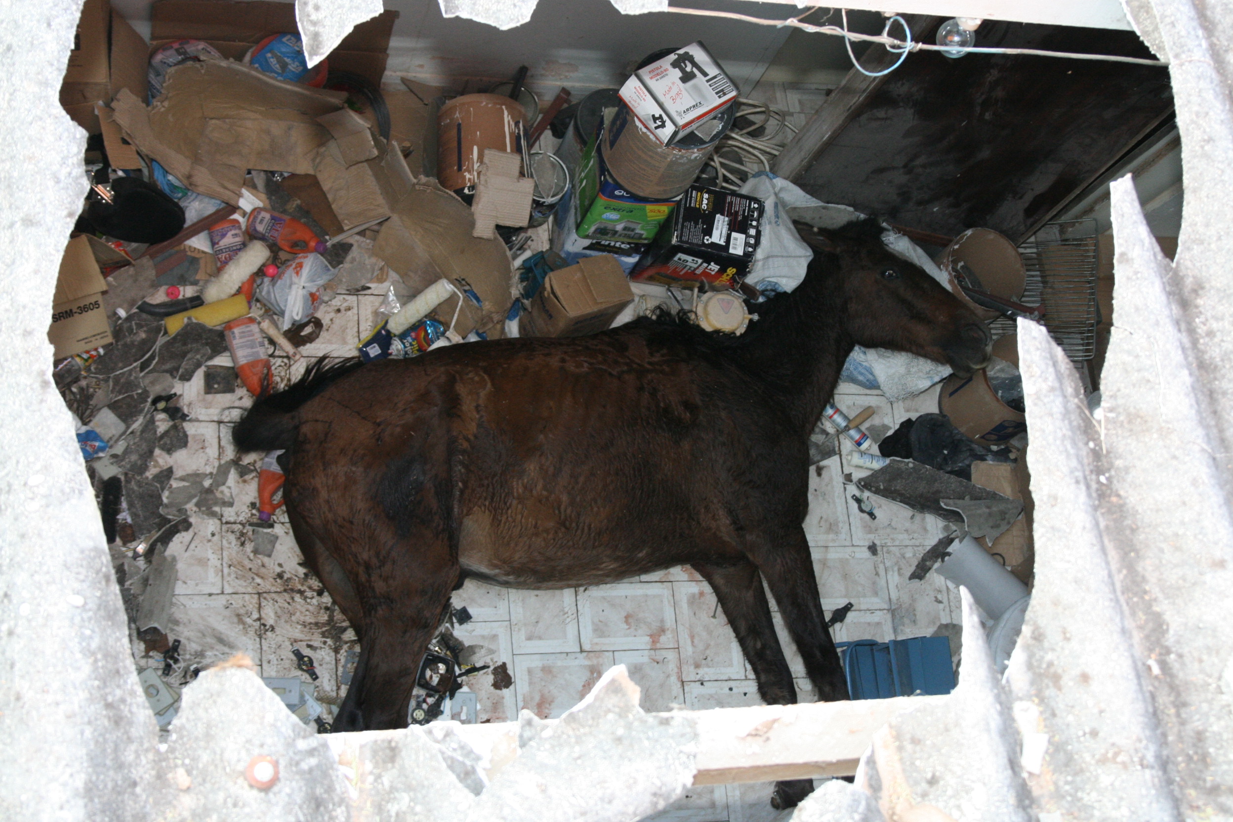Felizmente o cavalo não atingiu ninguém, mas o susto foi muito grande. O animal caiu na sala da casa, quebrando tudo ao seu redor. Como teve várias fraturas e não conseguia levantar, o bicho precisou ser sacrificado por um veterinário. O animal foi removido da casa após quase duas horas de intenso trabalho dos bombeiros.