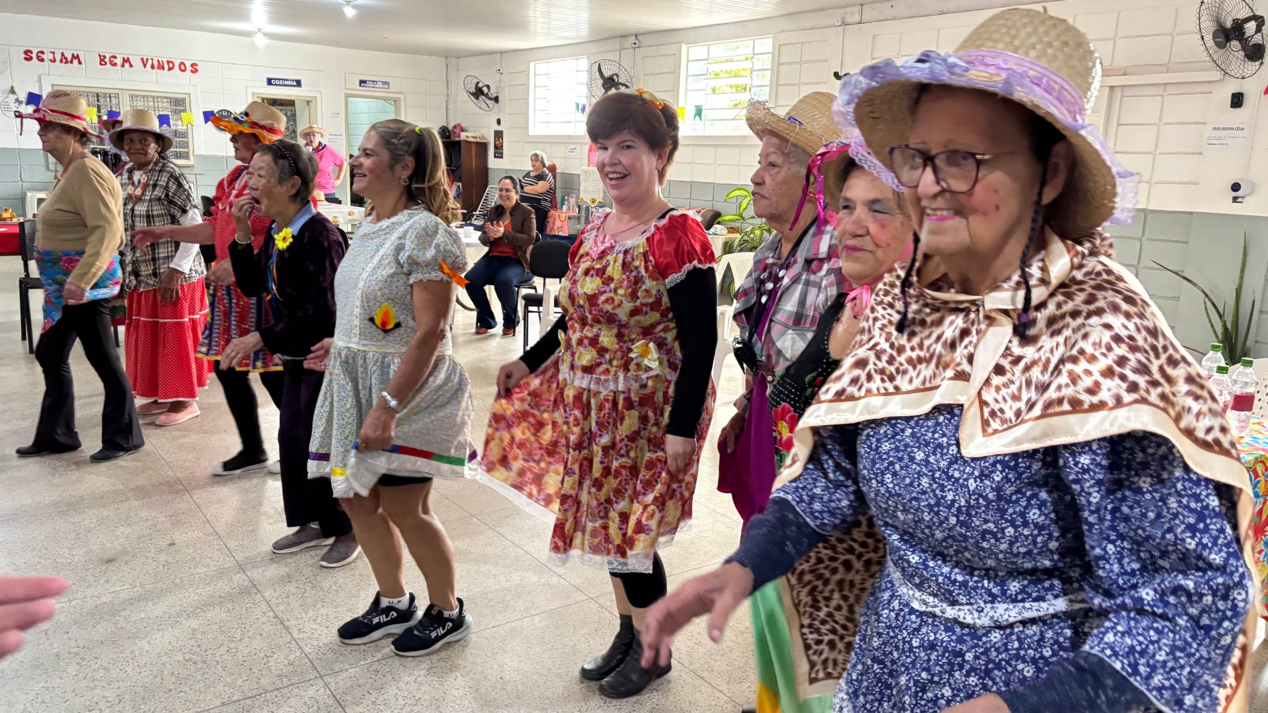 Nesta quinta-feira (5), o CDI Anos Dourados já entrou no clima junino com um ensaio geral. Idosos e servidores da unidade participaram caracterizados. A secretária municipal de Assistência Social e Cidadania, Hélide Parrera, e a presidente do Fundo Social, Paula Almeida, acompanharam a atividade.