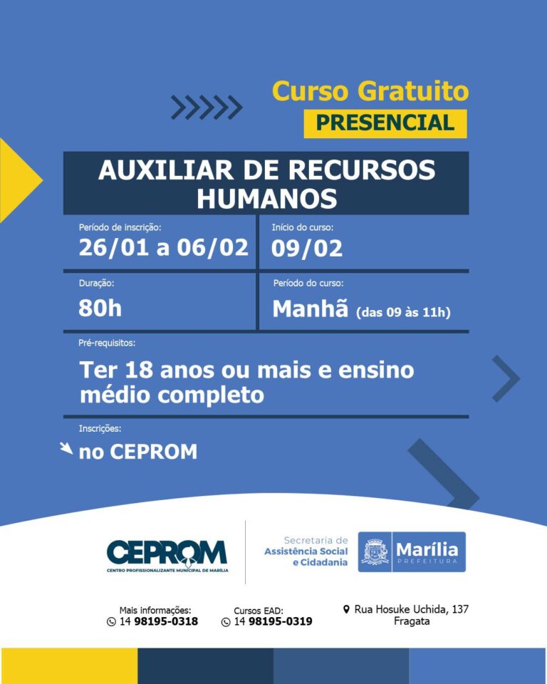 De acordo com a Prefeitura de Marília, na modalidade presencial estão disponíveis os cursos de auxiliar de Recursos Humanos (RH), no período da manhã, das 9h às 11h, e cuidador de idosos, no período da tarde, das 14h às 16h.