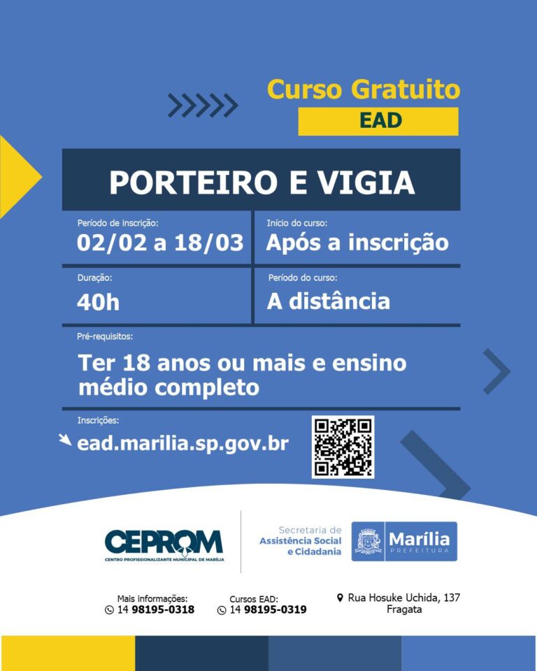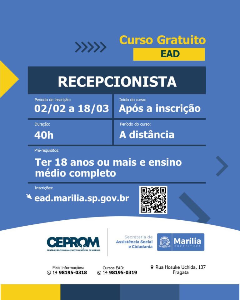 Já na modalidade de ensino a distância (EAD), o Ceprom oferece os cursos de recepcionista e porteiro e vigia. As inscrições poderão ser realizadas entre os dias 2 de fevereiro e 18 de março, por meio do site ead.marilia.sp.gov.br. Segundo a administração municipal, as aulas têm início imediato após a confirmação da inscrição.