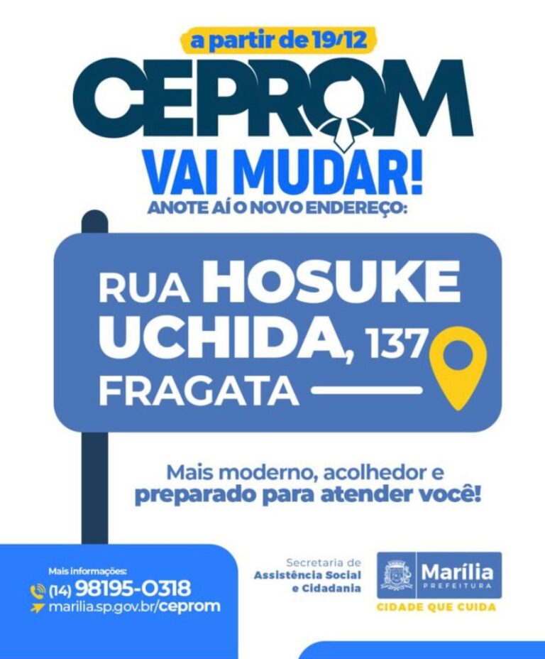O Centro Profissionalizante de Marília (Ceprom), serviço da Secretaria de Assistência Social e Cidadania, vai passar a atender em novo endereço a partir de 19 de dezembro. Segundo a secretaria, a unidade funcionará na rua Hosuke Uchida, 137, no Fragata, com estrutura ampliada para cursos de qualificação e ações de empregabilidade.