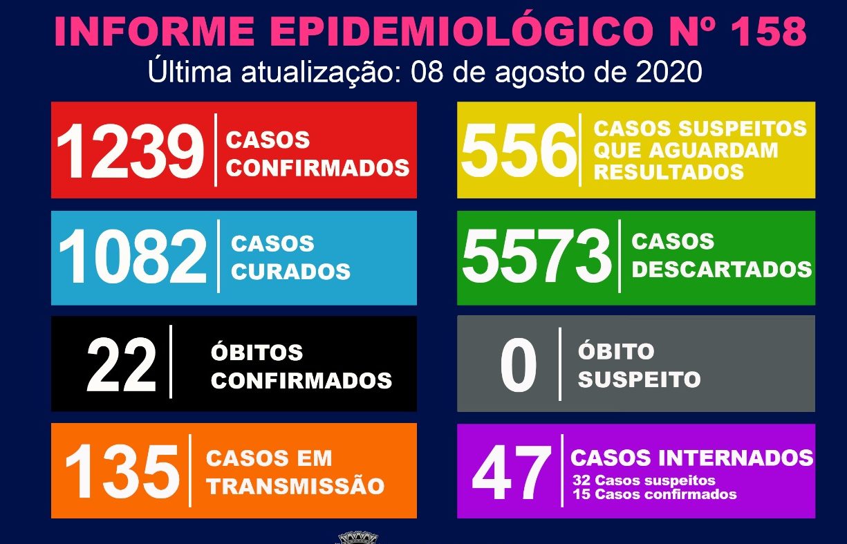 A cidade tem 1.239 testes positivos até o momento, dos quais 1.082 venceram a doença. Do total de confirmados, o município tem 22 óbitos – 1,7%. Já foram notificadas 7.368 suspeitas de Covid-19, mas 5.573 acabaram descartadas (75,6%).