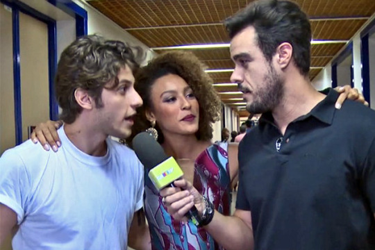 “E quando você faz piadas achando que funcionam e não funcionam como a Monica?”, brincou Chay Suede com a apresentadora do programa a pedido do repórter Joaquim Lopes. “Não sei se fui só eu, mas o Chay estava com um chupão no pescoço. Agora, fica a questão: quem é que fez esse chupão?”, disse a apresentadora.