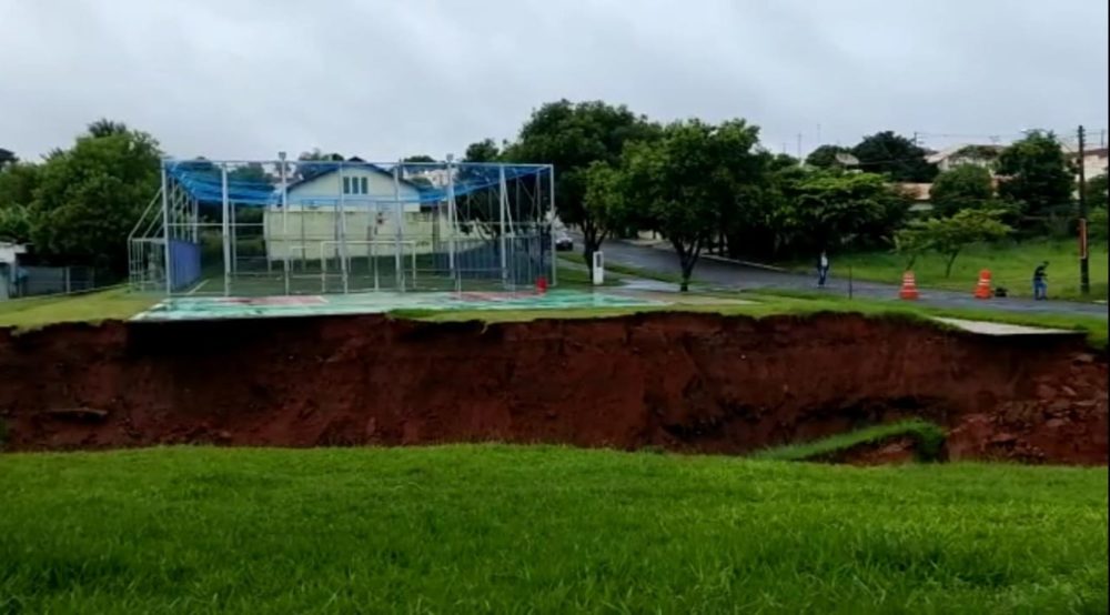 A forte chuva que caiu nesta quinta-feira (23) abriu uma cratera com cerca de 50 metros na Praça Quinhentos Anos, no Centro de Tupã (distante 75 quilômetros de Marília). A tubulação com cerca de quatro metros que passava por baixo do espaço cedeu.