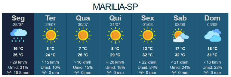 A partir desta terça-feira (29), uma frente fria avança sobre o interior paulista, provocando queda acentuada nas temperaturas em Marília, principalmente durante a madrugada e nas primeiras horas da manhã. As mínimas previstas variam entre 7 °C e 8 °C até quinta-feira (31).