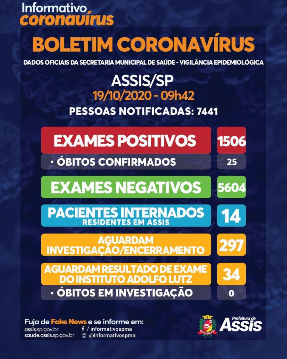 O boletim mostra que 1.506 assisenses foram confirmados com a doença, dos quais 25 evoluíram para óbito e 5.604 tiveram exames negativos.