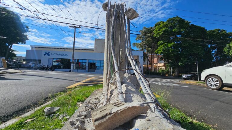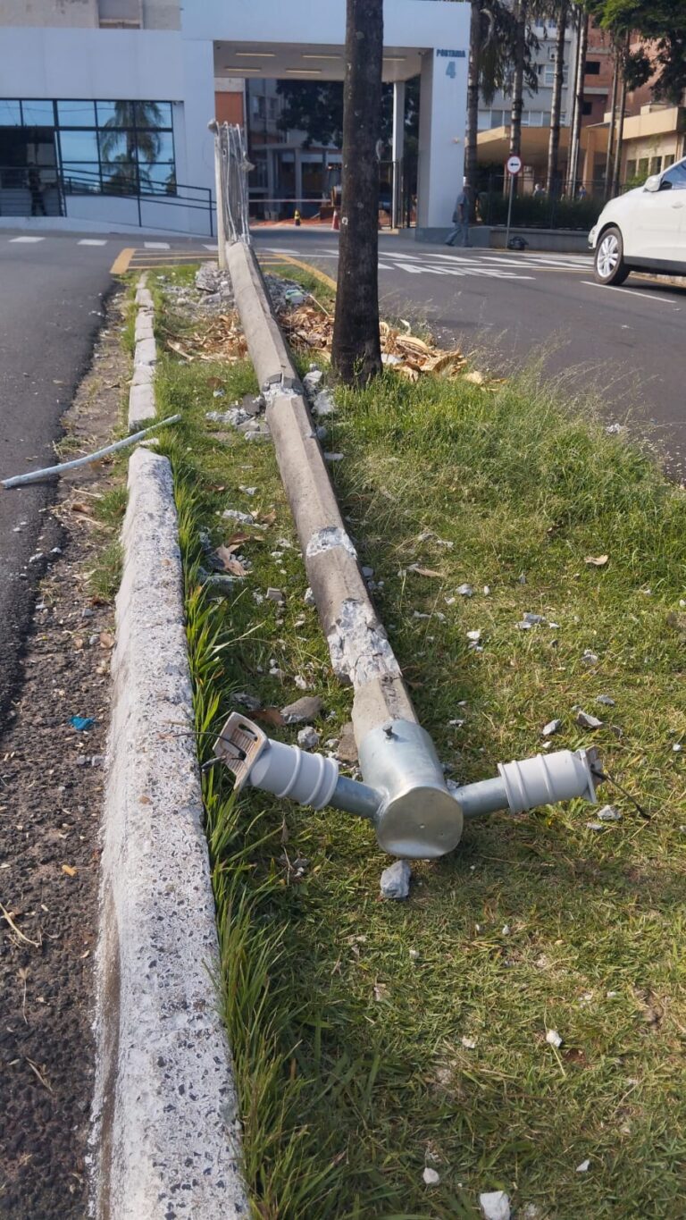 Outro poste foi destruído na avenida Monte Carmelo. Ainda não há nota oficial sobre esse caso, mas a Emdurb monitora a situação para evitar riscos.