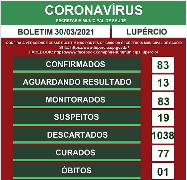 A Prefeitura de Lupércio (distante 34 quilômetros de Marília) informou a primeira morte provocada pela Covid-19 nesta semana. O óbito foi informado na segunda-feira (29), mas não há detalhes da vítima.