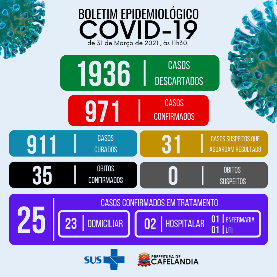 A cidade soma 971 casos positivos, sendo 35 óbitos e 911 curados.