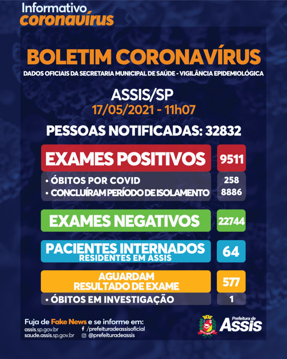 Assis tem 9.511 casos confirmados, dos quais são 8.886 curados e 258 óbitos. Há uma morte, de uma mulher de 53 anos, em investigação.