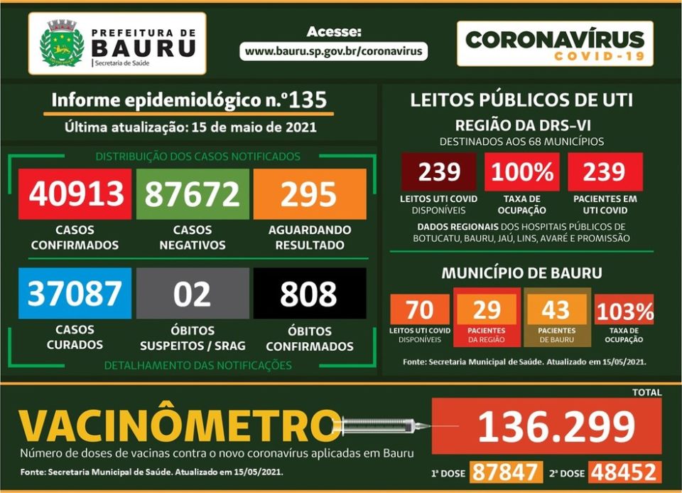 Bauru contabiliza 40.913 casos confirmados da doença, dos quais 37.087 estão curados e 808 óbitos. Há duas mortes em investigação.