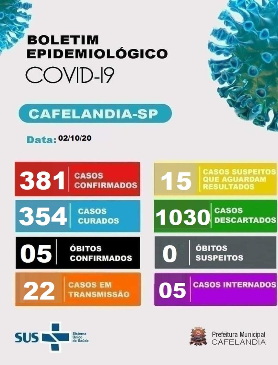 A Prefeitura de Cafelândia (distante 74 quilômetros de Marília) confirmou nesta sexta-feira a quinta morte pelo coronavírus. Não foram divulgados detalhes da vítima.