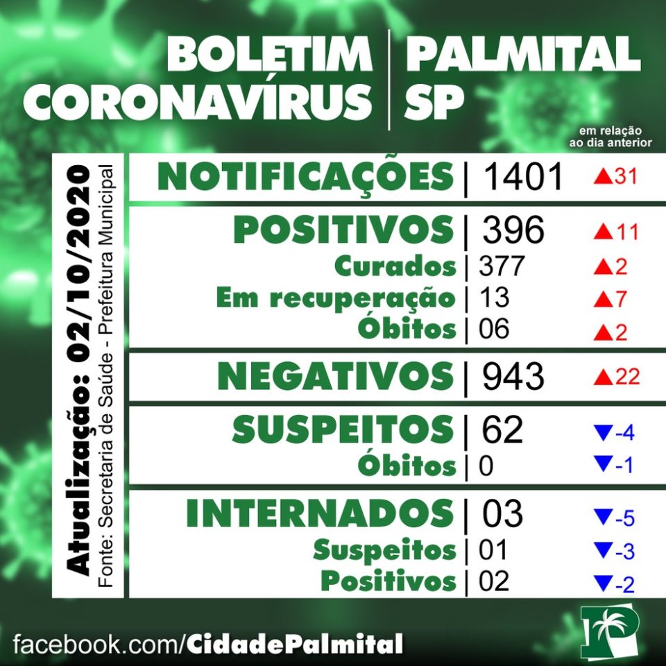 Palmital soma 396 casos confirmados da doença, sendo 377 curados e seis mortes. Outros 62 casos suspeitos aguardam exames.