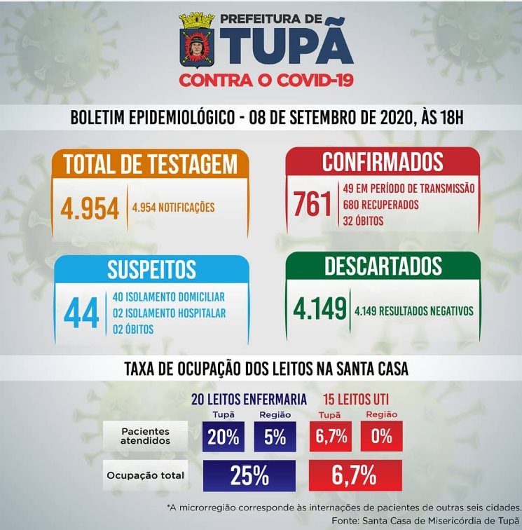 A cidade tem 761 testes positivos desde o início da pandemia, sendo 32 mortes e 680 considerados recuperados. O boletim traz outros 44 casos suspeitos, entre eles, dois óbitos estão em investigação.