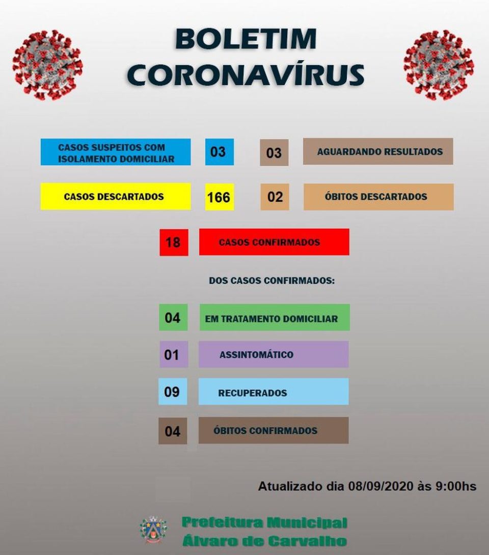 A Prefeitura de Álvaro de Carvalho (distante 44 quilômetros de Marília) confirmou nesta terça-feira (8) a quarta morte por Covid-19. Não foram divulgados detalhes sobre a vítima fatal.