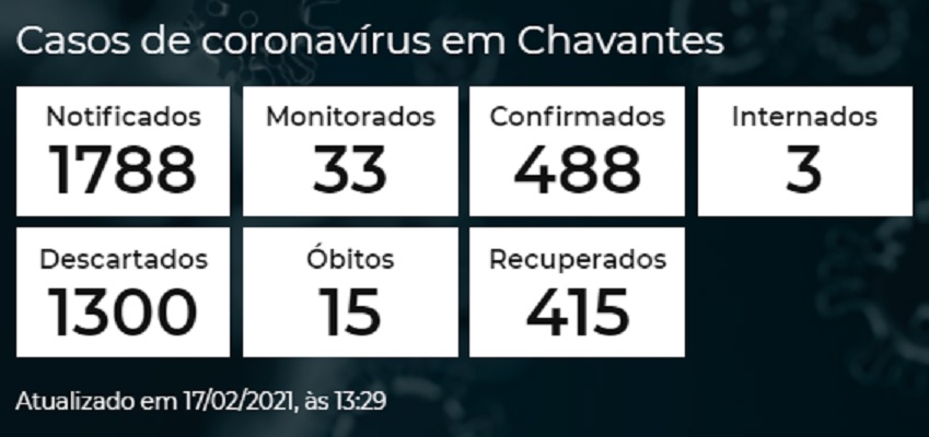 Chavantes contabiliza 488 testes positivos da doença, dos quais são 415 curados e 15 óbitos. Outros 33 casos seguem em investigação.