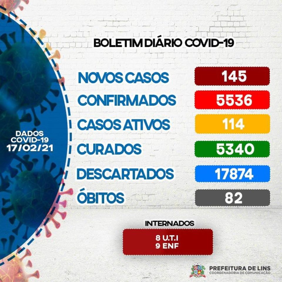 Lins registra 5.536 casos confirmados, dos quais são 5.340 curados e 82 óbitos.
