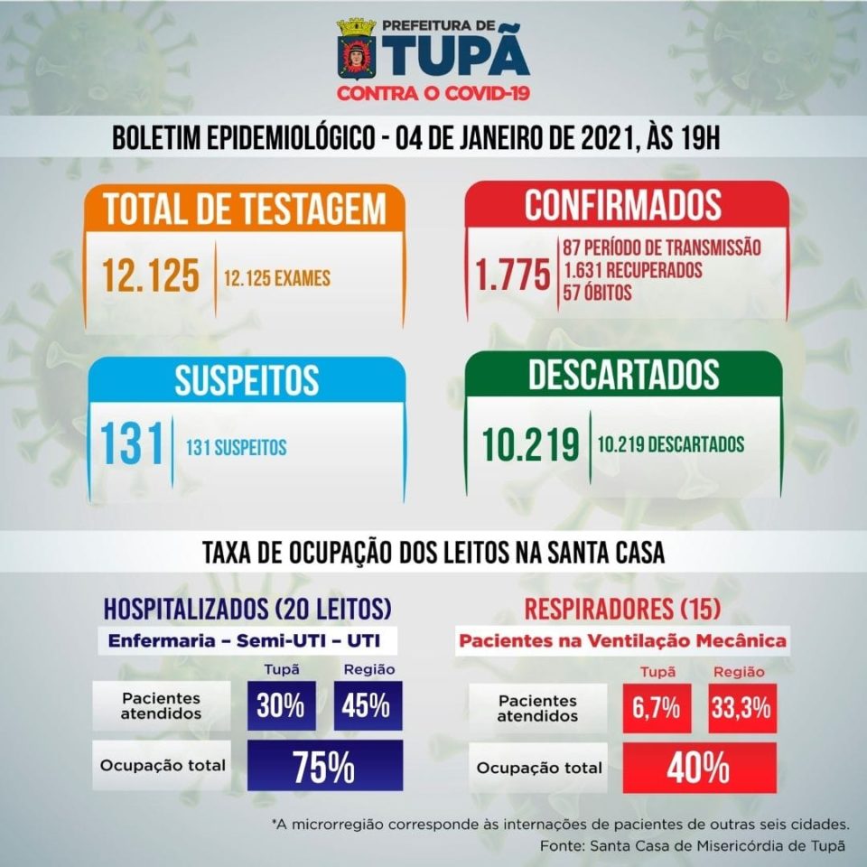 Tupã tem 1.775 testes positivos, dos quais 1.631 são curados e 57b morreram.