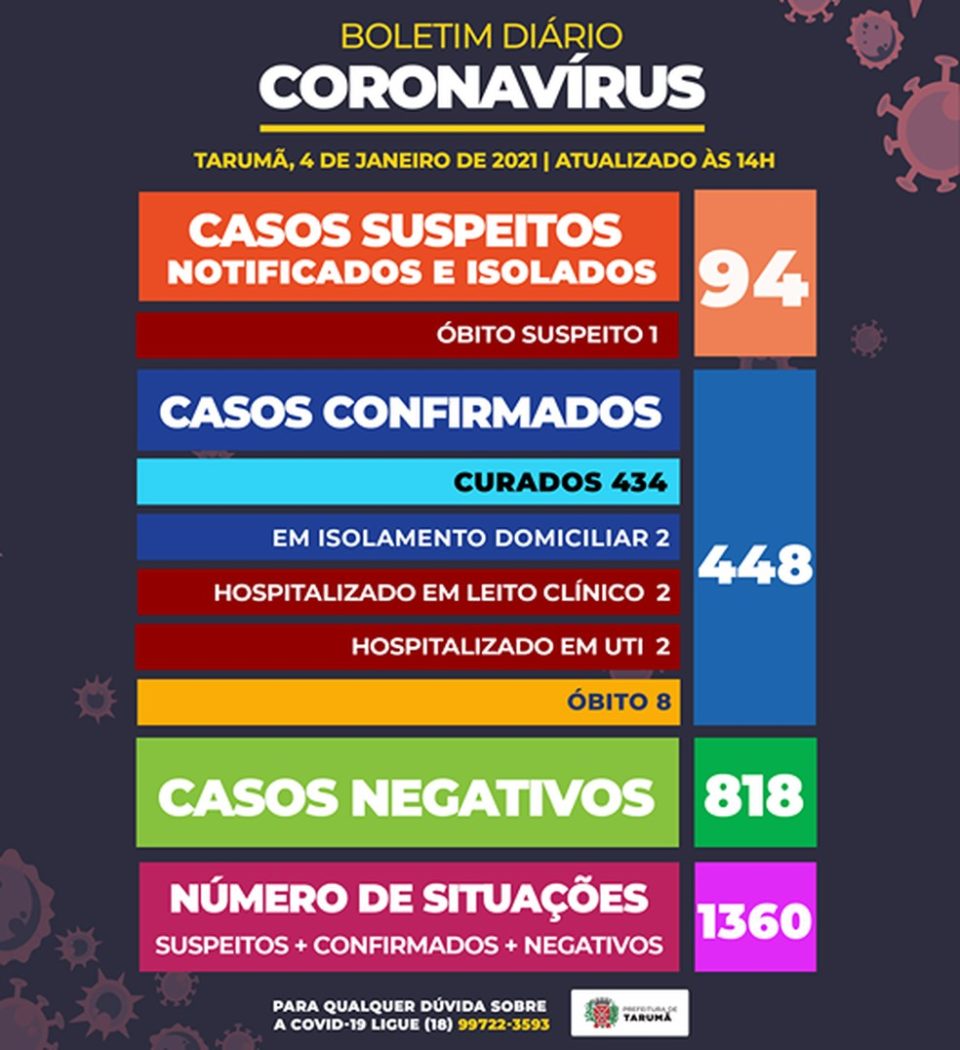 Tarumã tem 448 casos positivos, dos quais 434 já estão curados e oito morreram. Há uma morte suspeita em investigação.