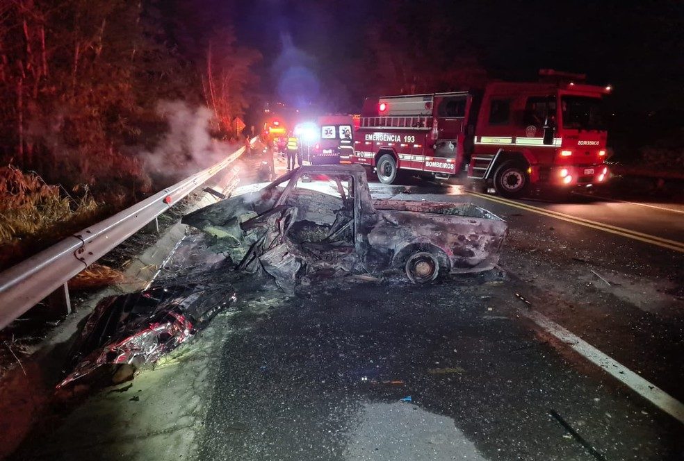 Com impacto, o automóvel com placas de Paraguaçu pegou fogo e os três ocupantes morreram carbonizados.