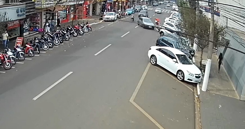 A batida ocorreu por volta das 13h30, no Centro da cidade. O veículo Chevrolet Corsa segue pela rua Antônio Carlos Mori, na faixa da direita, quando vê uma vaga de estacionamento do lado esquerdo e faz a conversão sem ver o motociclista, um entregador de comida, que transita pela pista da esquerda.