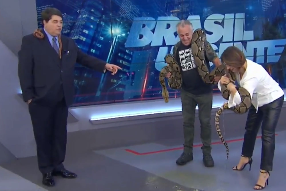 Enquanto Datena tinha uma cobra pequena em seu pescoço, um especialista segurava uma espécie maior com a ajuda da apresentadora Catia Fonseca.