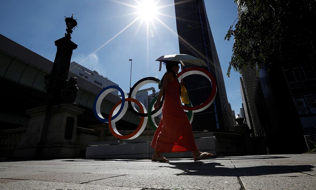 Mulher se protege do sol em frente aos aneis olimpicos em Toquio