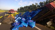O caminhoneiro, que carregava cerca de 14 toneladas de ração para cães e gatos, sofreu ferimentos leves e foi atendido na Unidade de Pronto-Atendimento de Garça.