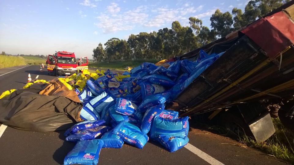O caminhoneiro, que carregava cerca de 14 toneladas de ração para cães e gatos, sofreu ferimentos leves e foi atendido na Unidade de Pronto-Atendimento de Garça.